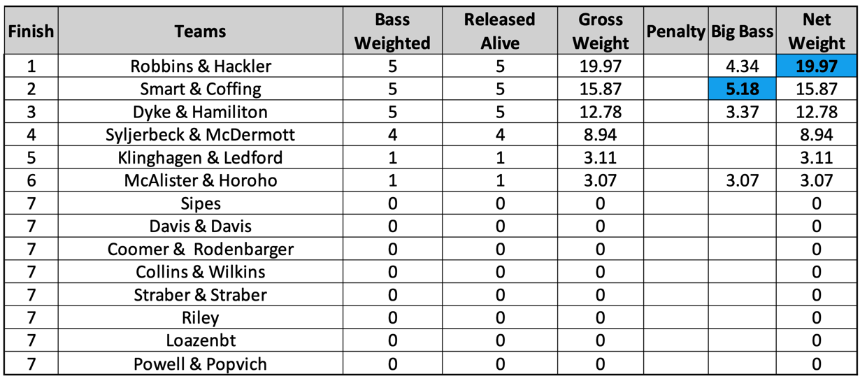 ![]() Shayne Robbins & Jeff Hackler - 19.97 ![]() Dave Coffing & Bud Smart - 15.87 w/ 5.18 Big Bass ![]() Matt Hamilton & Zack Dyke - 12.78 |